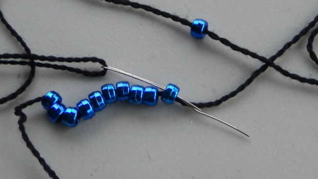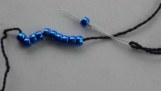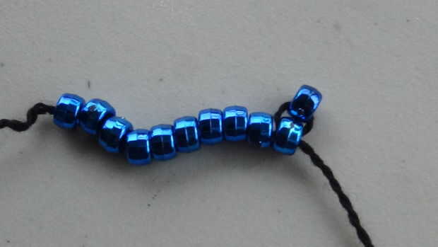 Una vez que el grano nuevo se rosca en tomar su aguja y ponerlo a través del talón en el borde de la primera fila (lo que antes era la perla más cercana a la aguja). La aguja pone en el grano de la misma dirección fue previamente, como la aguja va en un círculo. Entonces tire firmemente. Felicidades tienes su primera puntada.