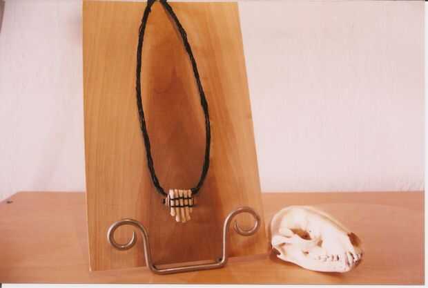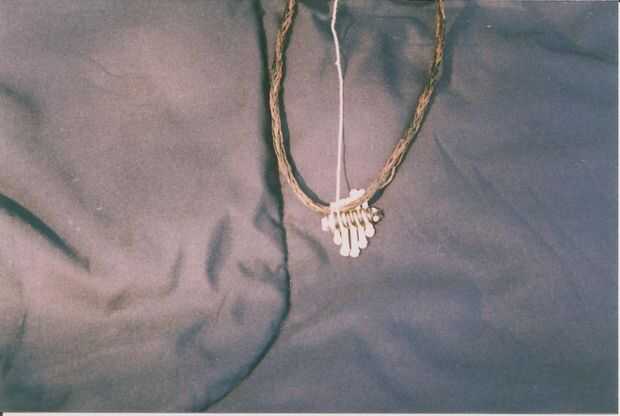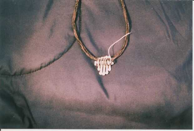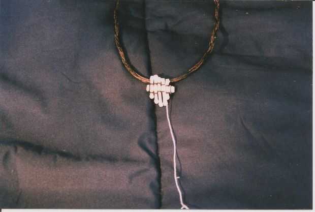 Esto se puede hacer un par de maneras diferentes, decidí usar hilo blanco envuelto entre los huesos y sobre el collar de cordón para unir los dos. Esto detiene cualquier movimiento entre el pendiente y el collar. Preferí que sea robusto en vez de colgando del collar.