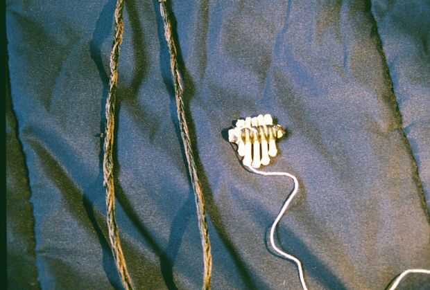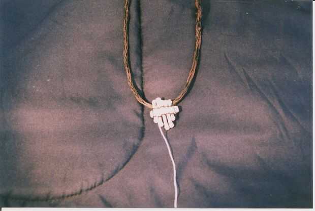 Coloque el cordón detrás de los huesos y sobre el soporte de madera. Atar el hilo en el colgante, luego levante y abrigo sobre lo cordones que va entre los dos huesos. Continúe envolviendo firmemente ha envuelto la rosca entre cada par de huesos. Atar como usted por favor, he usado un nudo cuadrado simple. Corte el sobrante y su collar será completa!