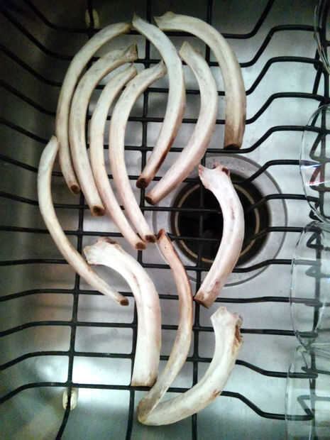 En un recipiente plástico, agregar agua tibia y una pequeña cantidad de jabón. Mezclar bien. Agregar los huesos. Deje en remojo durante un mínimo de 4 horas. La dejé toda la noche. Cuando se hace, cualquier exceso carne y la salsa han separado para los huesos.
