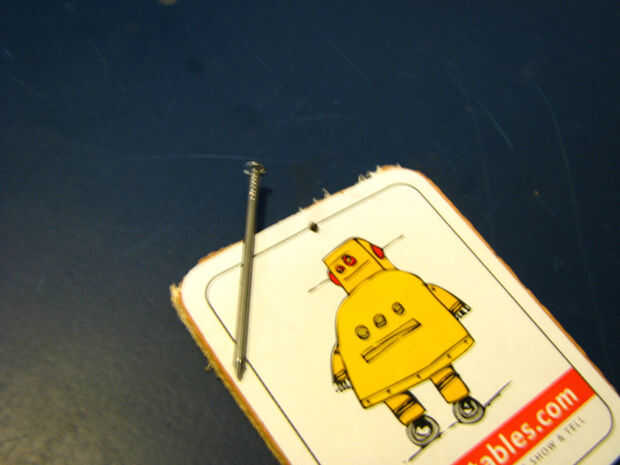 Hacer dos agujeros pequeños en la parte superior de madera con un clavo. Debe estar cerca.
