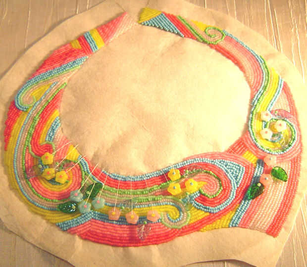 Arregló las flores de vidrio y las hojas en el cuello e hilvanadas en el lugar con algún hilo inútil.  Entonces anclado mi hilo en la parte posterior y cosido para arriba a través de los granos, a través del centro de la flor, a través de un grano de semilla y a la flor y el forro.
