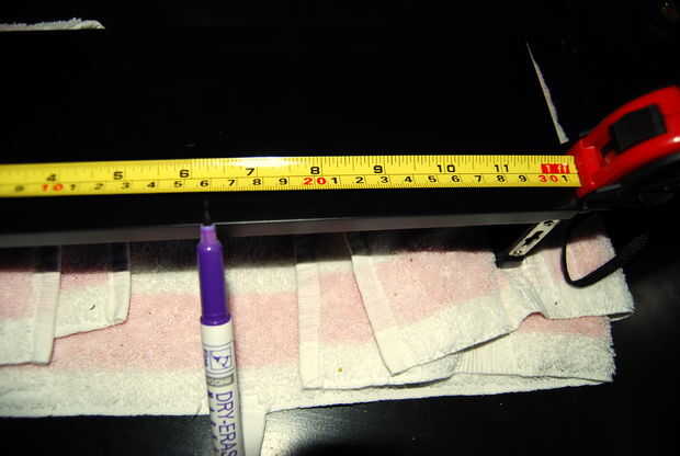 Los otros lugares para los ganchos de la marca. Hice 7 en la fila de atrás: 1 en cada borde, luego espaciados 2 más uniformemente entre los ganchos de centro y borde.