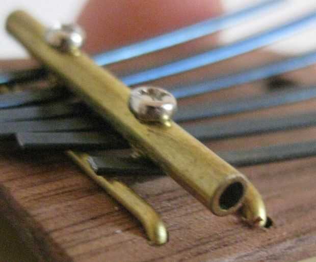 Con la obtención del tubo superior. Lugar entre los dos cables puentes y marca dónde están los agujeros. Otra vez le taladre dos agujeros de sólo lo suficientemente grandes como para que tu los pernos pequeños se deslice a través. Quite los tornillos y el tubo superior.