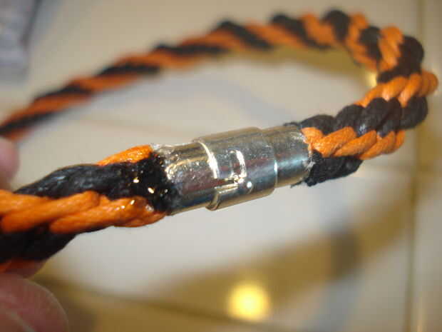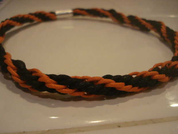 Nosotros hemos ampliado desde entonces para hacer collares también, y el diseño de gigantes de SF naranja y negro es por lejos el más popular. Rowan aún está recibiendo órdenes de personas totalmente desconocidas que aman el collar que usa día y noche. El collar que está haciendo justo ahora es que nuestra bibliotecaria local, que se compra como un regalo de cumpleaños para su hermano. Se tarda aproximadamente una hora para hacer el collar.