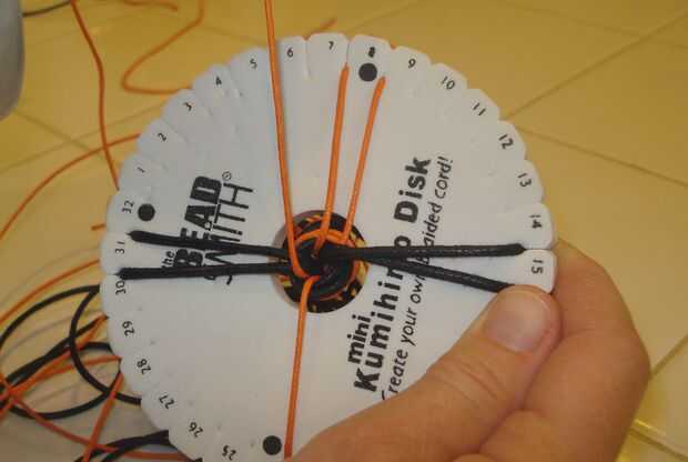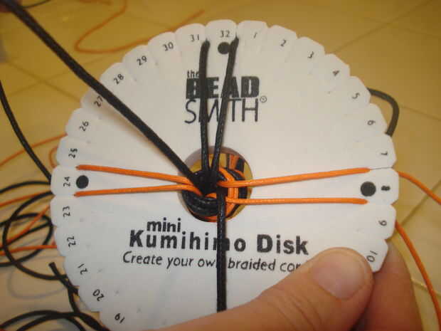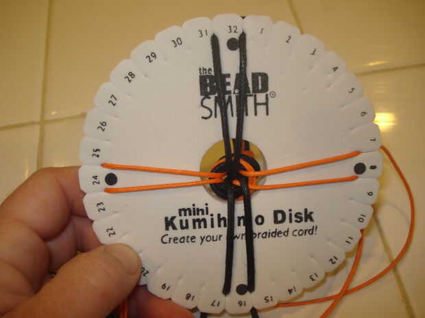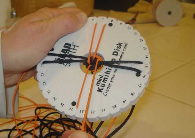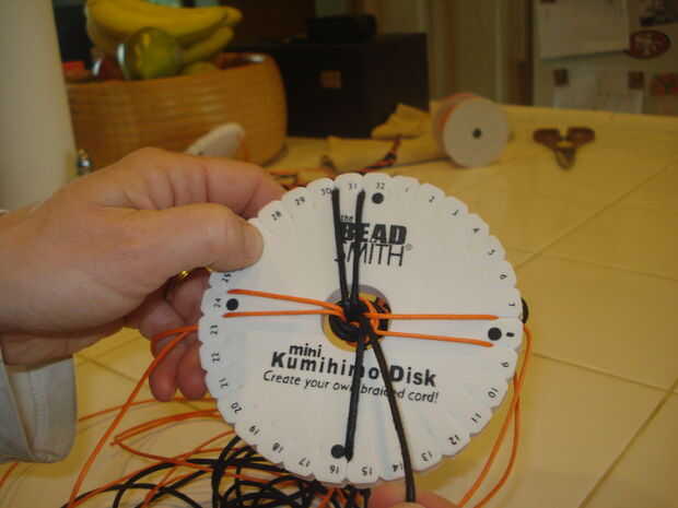 3.) poner el nudo a través del centro del disco de Kumihimo.