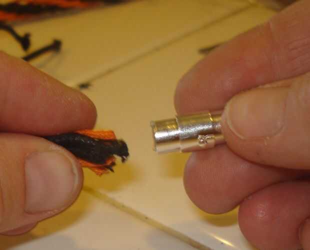 9.) salir el pegamento E6000. Corte la cuerda recta y poner el pegamento dentro de la tapa magnética. Coloque el cable dentro de la tapa y sostenerla todavía.
