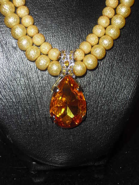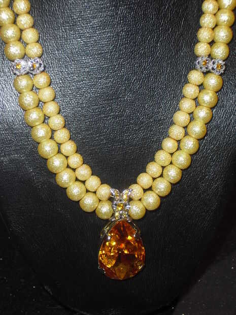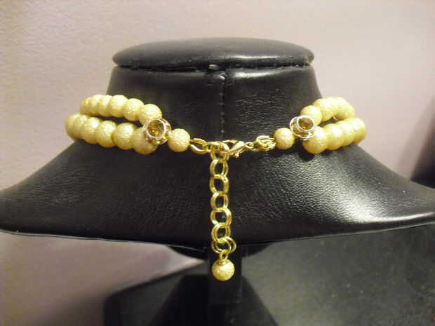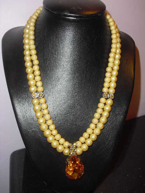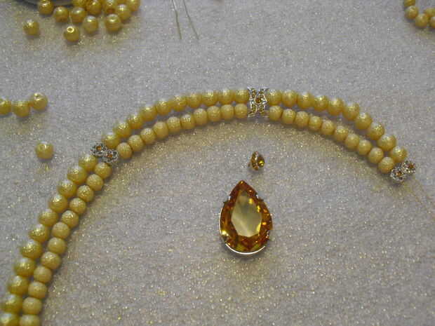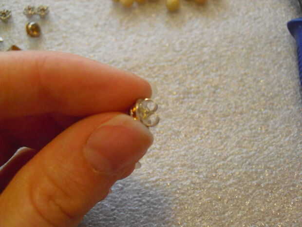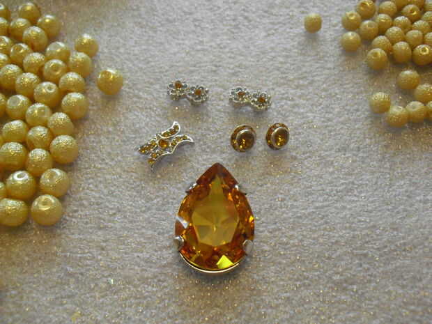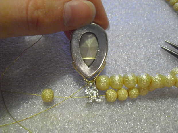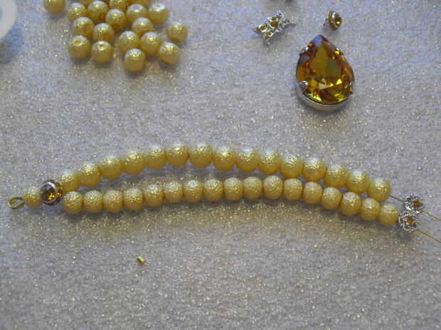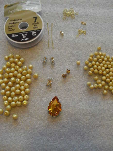 Los materiales que utilicé fueron algunos 8 mm ronda abalorios y 6 mm juego de granos redondos, dos de cada tipo de espaciador (redonda y flores), 1 Espaciador medio, un cristal de la lágrima de doble agujero, unas anillas de 4 y 6 mm, algunos tutores de alambre, Tigertail-tipo alambre de nylon, algunos alfileres de cabeza de oro, oro Chafas y oro langosta cierre.