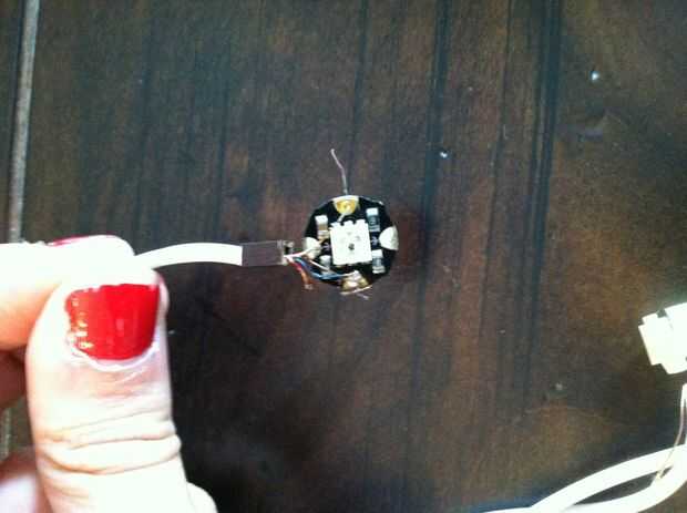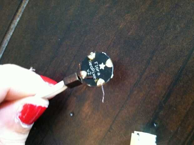Aquí, yo he soldado los cables de auriculares a este neopixel Adafruit. Esto es difícil porque los cables de auriculares son difíciles de soldar, así que uso un montón de flujo, tener paciencia y mantener copias de seguridad! En mi proyecto en particular, sueldan los alambres de un cable para energía y señal y uno de los cables desde el segundo cable a tierra. Luego usé los auriculares como un broche para el collar, así como un interruptor para activar (va desde la batería a través de neopixel, hacia fuera a través del cable de auriculares y de nuevo a la conexión a tierra de la batería).