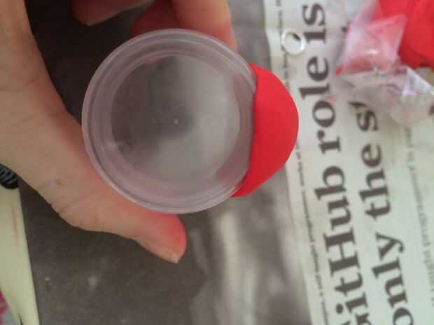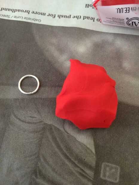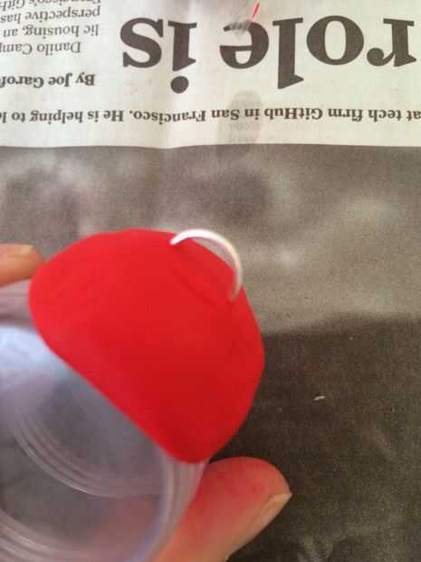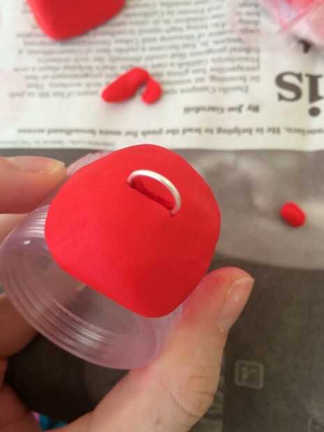 -tomar un trozo de arcilla roja y el lugar en el área bajo la parte expuesta del anillo del salto y presione suavemente sobre el resto de la parte superior. Esto asegurará el anillo del salto en la parte superior. Este es un paso importante porque después cuece al horno la parte superior, el colgante de bola de goma se cuelga de la cadena de este anillo del salto. Si no haces el anillo del salto seguro, el collar podría romperse más tarde!