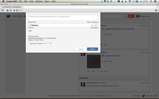 Ir a tu panel de control, haga clic en herramientas en su nuevo diseño ellos exportación como DXF. Cuando para su DXF archivo que aparezca en tu panel de control y descargar!