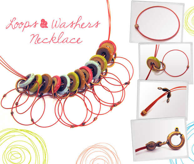 Este collar es un divertido juego de la geometría de las arandelas, anillos de salto grande gruesa y bucles de alambre SoftFlex. El cable de color rojo una manzana reineta hermosa y juega los esmaltes y el cobre. Los lazos del alambre son ligeros de peso y voltear y mover con el diseño. El diseño utilizado inicialmente plegadores y encrespadura cubre para terminar los lazos colgando del SoftFlex, pero el peso de las cubiertas de prensado hecho todos ellos caen en la parte inferior del collar. El diseño se ve mucho mejor sin ellas!