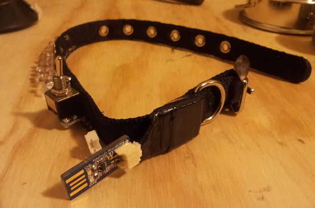 Elegí la pila para el collar de la cinta por si acaso alguna vez necesito reemplazarlo. En la foto, puedes ver como se ve cuando la batería no está conectada a los LEDs, pero está conectada al cargador. En este estado, puede conectar su collar en el puerto USB del ordenador y cargar para arriba! Una vez hecho, sólo Retire el cargador y enchufe la batería en los LEDs.