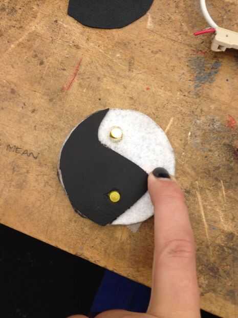 Después de terminar el circuito, marqué en las prendas donde soporte de LEDs. Corté dos agujeros pequeños para ellos. A continuación, os pongo a las telas sobre el circuito. He probado si funcionan los LEDs.