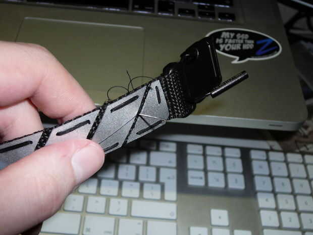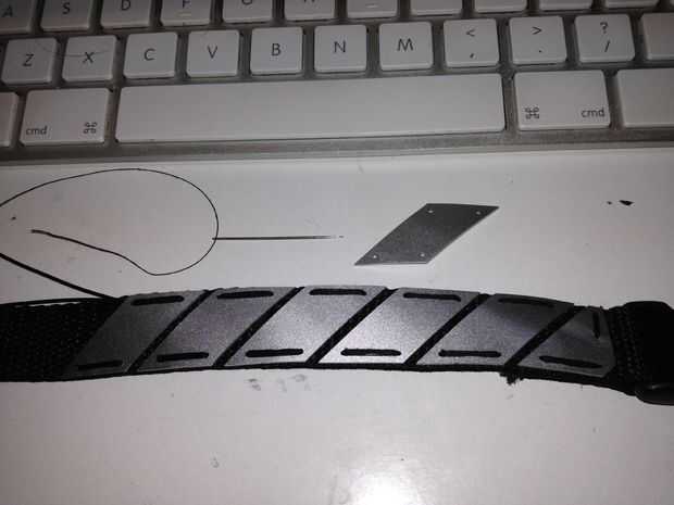 Después fueron cortar todas las piezas de aluminio, comencé a verlos en la correa negra con hilo y aguja.