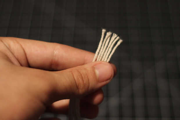 En primer lugar, los hilos a través del anillo del hilo de rosca y empuje el anillo a la mitad de las tres cuerdas. Unir ambos extremos de los filamentos y tendrás seis cuerdas en longitudes iguales.