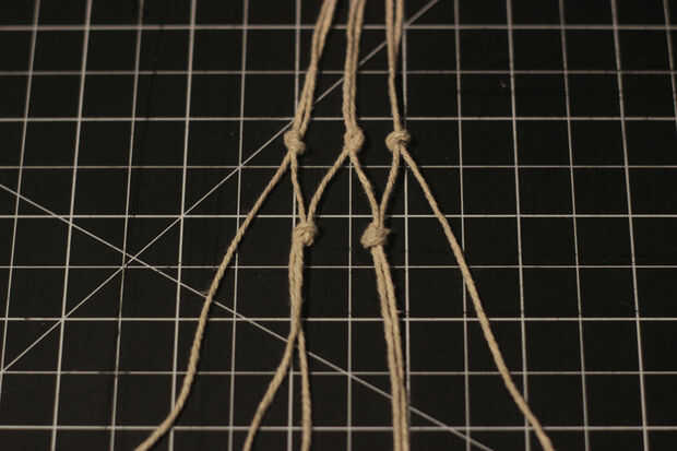 Ahora que tienes tus primer nudos atados, separe las seis hebras y les sección apagado con los filamentos de los nudos vecinos. Usted tendrá dos cadenas simples a cada lado y dos secciones de dos hilos en el medio.