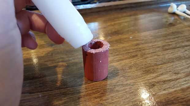 La cera de abejas estará un poco pegajosa. Deje que se enfríe. Luego frote una cera más dura en la parte superior. He utilizado una vela blanca de la tienda de comestibles. Esto funcionó muy bien porque podía pegar el extremo pequeño de la vela en el extremo abierto de la botonera muy fácilmente.