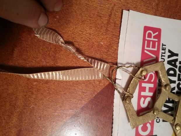 Cortar unos 10" de cinta dorada y un nudo en los extremos. Bucle de los bucles de alambre y lazo en la parte posterior del cuello.