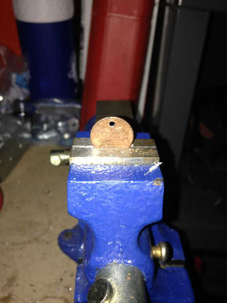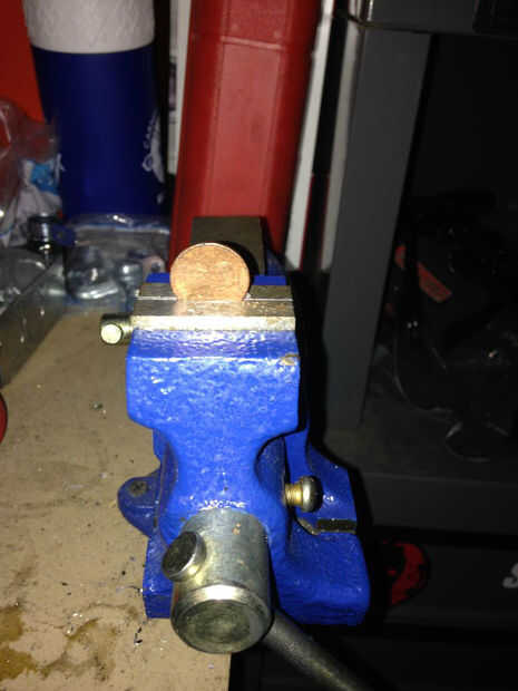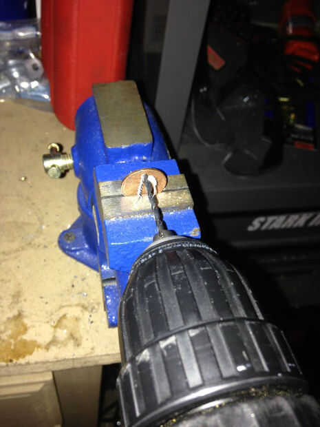 Primero me sujeta los centavos en mi vicio y trató de utilizar un dremmel para perforar los agujeros pero mi herramienta de imitación y broca fue demasiado poder suficiente para hacer el trabajo. Mudamos a utilizar mi taladro y una broca pequeña de mi set de artesano.