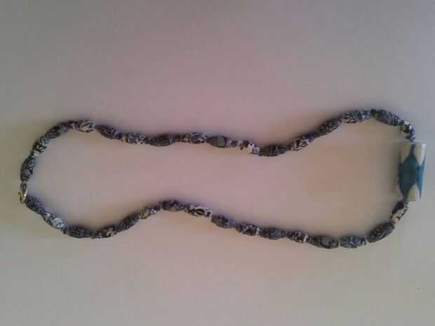 Lo que tienes que hacer esta vez es poner las cuentas en orden, por lo que el orden importa! Utilicé todos los 32 granos de papel enrollado para cada collar, pero usted puede ajustar la longitud. Como se puede ver, tengo un grano de gran centro y dividir los 32 granos a ambos lados del talón. También mezclé los granos, así que tengo una tira de papel A y otro de papel B.