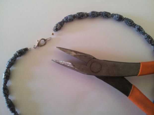 Volver a la cadena final mediante una encrespadura, un broche y el prensado, luego hacer el otro lado. Lo que tienes que hacer ahora es pizca los plegadores con las pinzas, luego cortan la cadena extra.