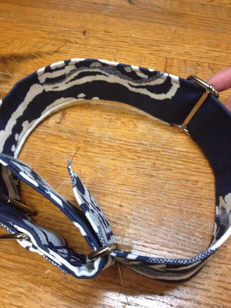 Ahora para la etapa más delicada en todo este proceso! Tomar la última pieza de hardware, el Ajustador deslizable y colócala en el extremo restante de la suelta del lazo largo. Toma un poco de cuidado para pasarlo bien. Después el extremo suelto de la rosca de largo lazo a través del Ajustador de la diapositiva, se enrolle a través del anillo oval restantes. Por último, enlacen a través de la parte inferior del Ajustador deslizable una vez más, tirando unos 1" vuelta contra sí mismo. (Esto puede ser un poco complicado! Ver las fotos para que enrosque el Ajustador deslizable. Este es el mismo arreglo roscado como cualquier correa ajustable, por lo que puede ser útil usar una correa ajustable en el otro collar, una correa del bolso, sujetador, etc. como un patrón de cómo enhebrarla si estás luchando.)
