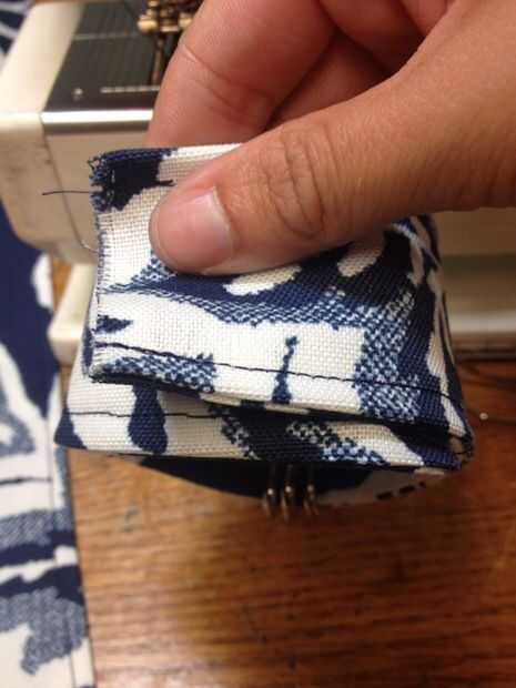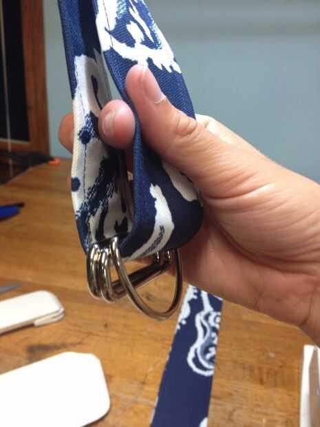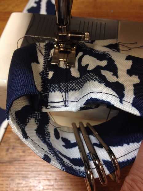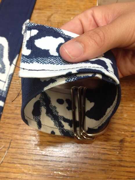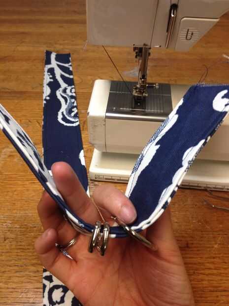 Dejar de lado la pieza más larga de la tela por ahora. Teniendo la pieza más corta, hilo en dos anillos ovales y el anillo en d. Traslape los bordes de la tela aproximadamente 2 pulgadas. Coser el borde superior en el lazo (yo uso un modelo de cuadrado y x, como puntadas en la foto, pero cualquier reforzado funciona bien.)