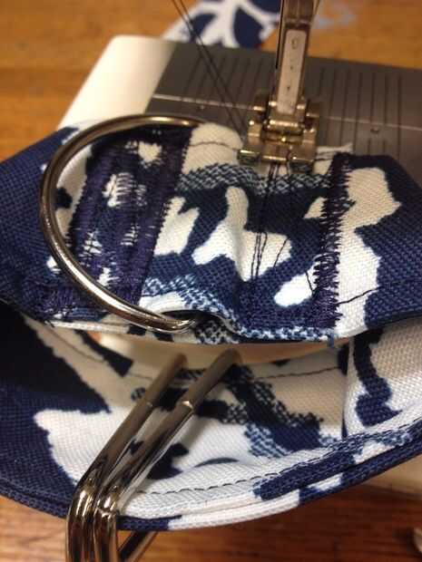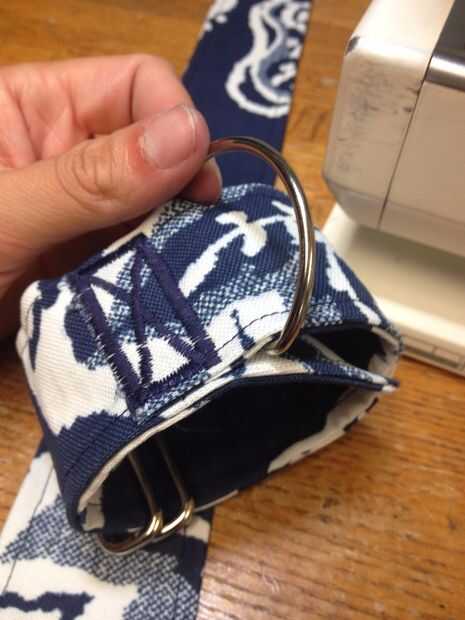 Tire el anillo en d para arriba y el borde superpuesto restante de tela. Al coser el borde segundo segura, el anillo d descansará entre las dos costuras. (Algunos de los puntos pueden conseguir un poco abultados por la máquina de coser - la más difícil parte de este proyecto es la gestión de la mayor parte del cuello y el hardware - ayuda a usar una aguja de coser para trabajo pesado.)