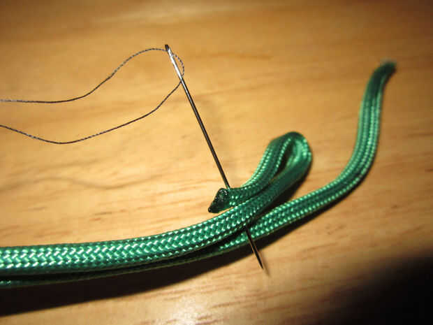 Ahora aquí es donde la aguja y el hilo. Doble la pieza de dos extremos donde los marcaste. Palillo de la aguja a través de ambos lados y puerca los dos juntos, como en la imagen. Me pasó con un par de veces luego envuelve el hilo alrededor varias veces, antes de ir entre el hilo y el paracord para mantener la banda de rodamiento de deslizamiento, entonces lo de. Lo mismo para la segunda pieza.