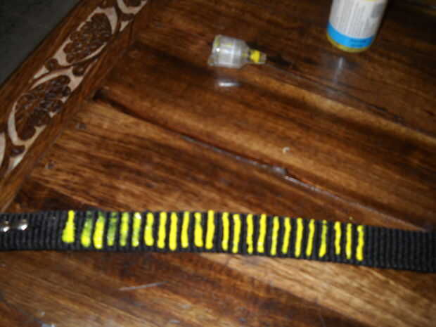 Tener una mano firme ayuda a hacer más ordenado, pero un par líneas onduladas son lindos también. En este punto puede hacer cualquier diseño que desee como estrellas, flores, huesos, impresiones de la pata, incluso peces si es para un gato. Hice el collar entero dejando espacios o la hebilla y agujeros. Puede Agregar destacados alrededor de los orificios demasiado, incluso escribió mis perros de nombre pero en la parte posterior.