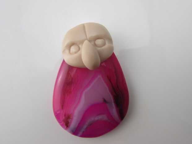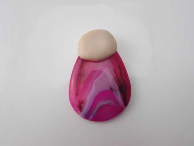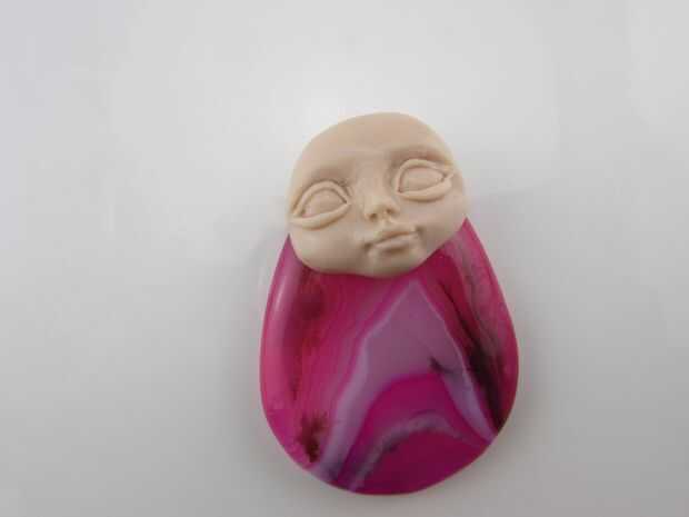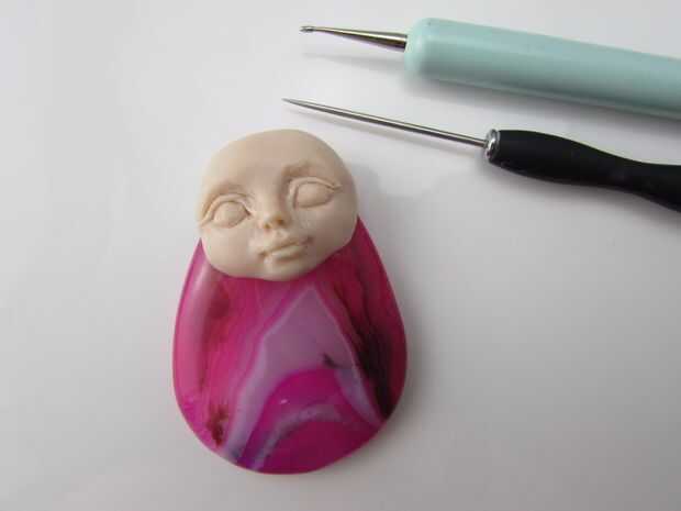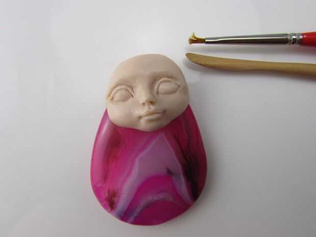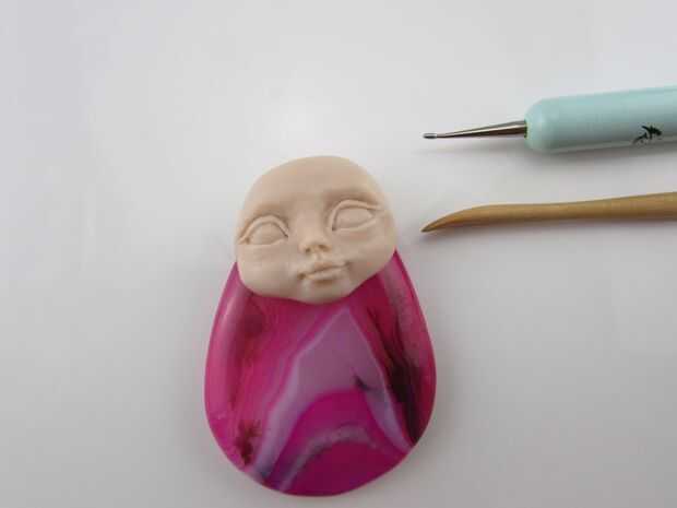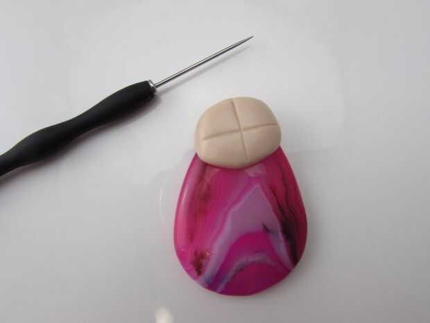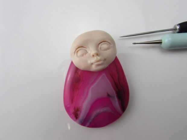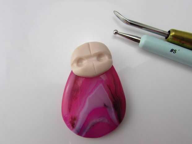 Empezar por hacer un aplanado, forma de la cara redonda y colóquela en la parte superior de la piedra preciosa en forma de gota de lágrima. Con una herramienta de la aguja, marque las líneas centrales vertical y horizontalmente. Esto más o menos le guiará donde pones los ojos, nariz y boca.