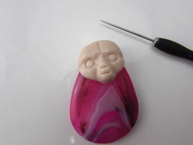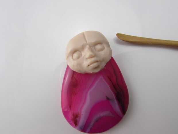 Haga una marca en la línea horizontal con una paleta en forma de herramienta para demarcar el frente de las mejillas. Luego con un bolillo, realizar 2 muescas para los zócalos del ojo. Se llenan los zócalos del ojo 2 piezas redondas pequeñas de arcilla y una pieza alargada entre los ojos por la nariz y la boca.