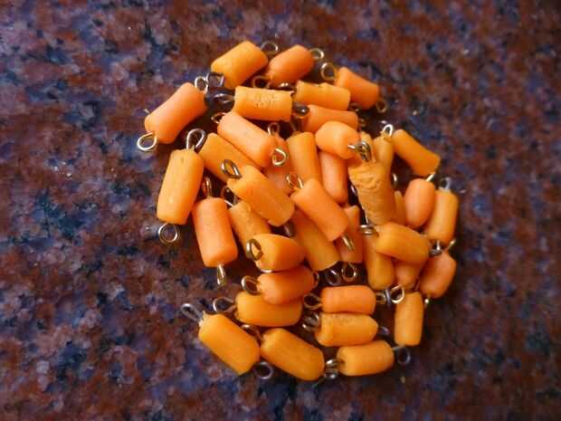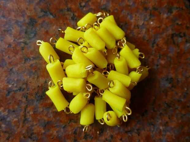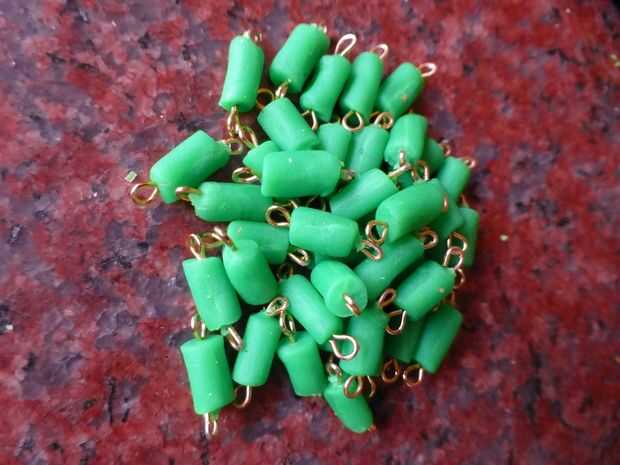 Usando alicates de punta redonda de hacer ojos en el otro extremo de los pernos de ojo. Ahora tenemos ojos en ambos lados de las larga cuentas.