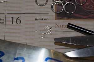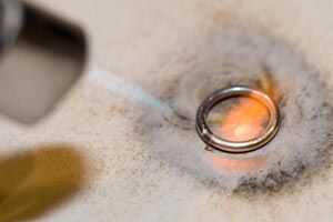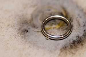 Ahora tenemos que soldar las anillas más grandes. Corté un montón de cuadritos de soldadura de la hoja (en este caso utilicé medio 70%, pero se recomienda a partir de 65% de fácil soldadura), cepillo algún flujo en cada corte, poner el anillo en un plato resistente al calor, puse una pequeña plaza de soldadura debajo del corte y luego calentar con un soplete pequeño hasta los flujos de la soldadura en el empalme. Generalmente pongo la soldadura en contacto con el anillo, pero debajo del ring. Porque la soldadura tiende a fluir a las zonas más calientes, y porque la antorcha calienta la parte superior más que la parte inferior, la soldadura será pronto "saltar" y desaparecer en la grieta.