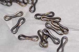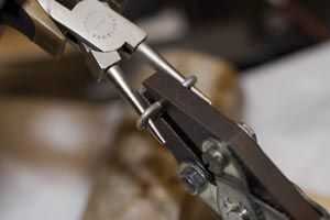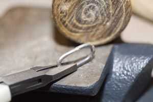Necesitamos formar los anillos de salto grande en lo que referiré a como anillos. Lo hago con dos pares de alicates--uno un par con nariz redondeada y un juego de alicates de mordazas paralelas. Utilice el par redondeado más como un separador, luego comprimir el centro del anillo del salto utilizando los alicates de mordazas paralelas. Puesto que los alicates de mordazas paralelas no se abren ancho suficiente, usar un martillo de cuero crudo primero para aplanar un poco los anillos grandes. Usted debe terminar con un montón de dogbone como cosas. Tenga en cuenta tienden tratar de poner la Junta soldada en el centro el dogbone. Posteriormente Envolvemos la sección central plana y ocultará las irregularidades de la soldaduras.