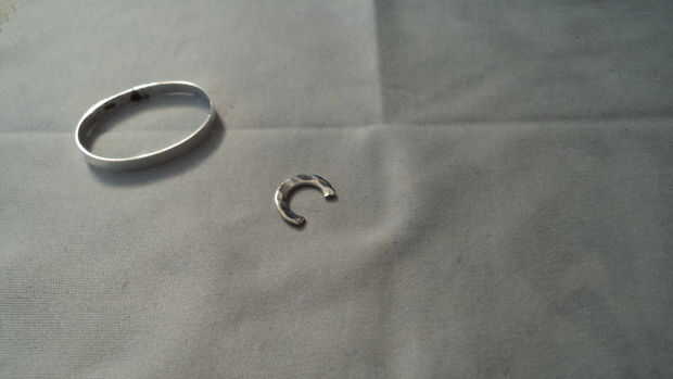 1. Saque la arandela de plata y la sierra joyeros cortada apenas un poco menos la mitad de la lavadora fuera, entonces presentar los bordes cortados. Estas soldadas a la placa base y utilizadas para conectar entre sí las placas base.