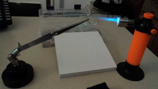 3. con la tercera mano o solderite Junta lugar flujo y medio soldadura en alambre bisel conjunto. Entonces usando el calor de la antorcha de la soldadura hasta que fluye sobre la Unión.