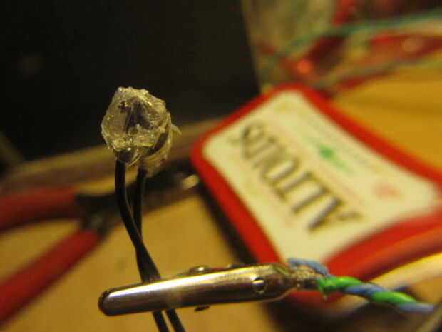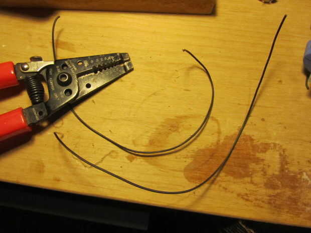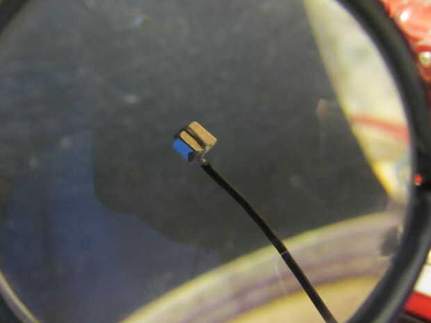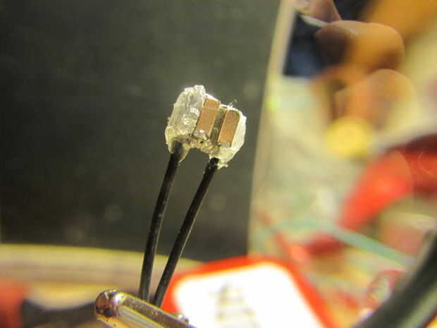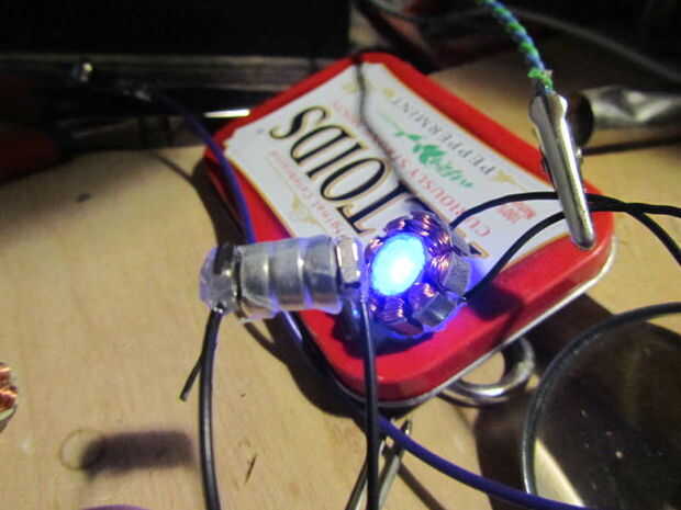 Corte y pele los cables de los conexión para el LED y el pegamento caliente los cables. Tuerza el alambre sobre el imán y pegamento caliente en el lugar y marque las polaridades en el imán. Conectar las pilas de botón entre los imanes y se iluminará. Si la dosis no enciende cheque las polaridades y las conexiones del LED.