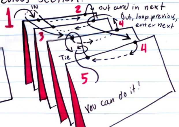 Básicamente estos usted está atando juntos en un lazo. Para empezar, meter en la sección 1 del exterior, dejando una cola que se pega en el exterior. Salir por el otro agujero y meter en la sección 2 desde el exterior. Un nudo en el extremo de la cola, y luego entrar en sección 3.