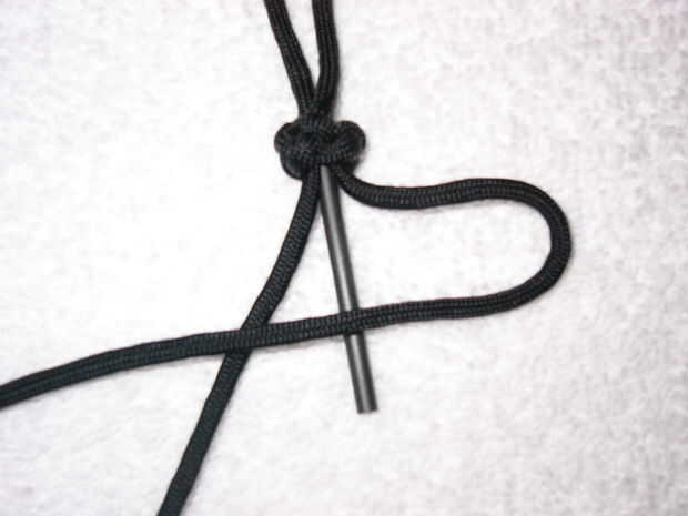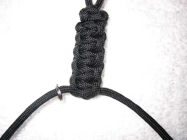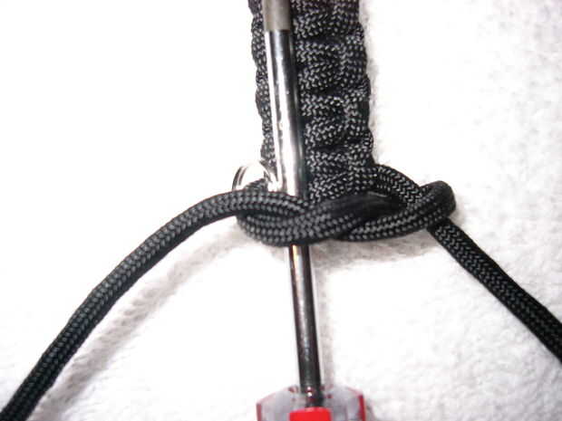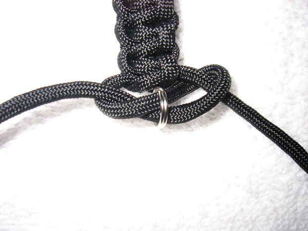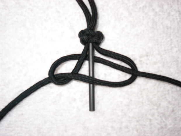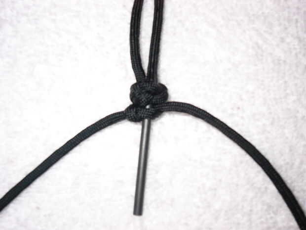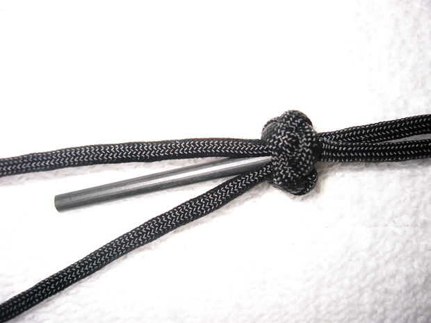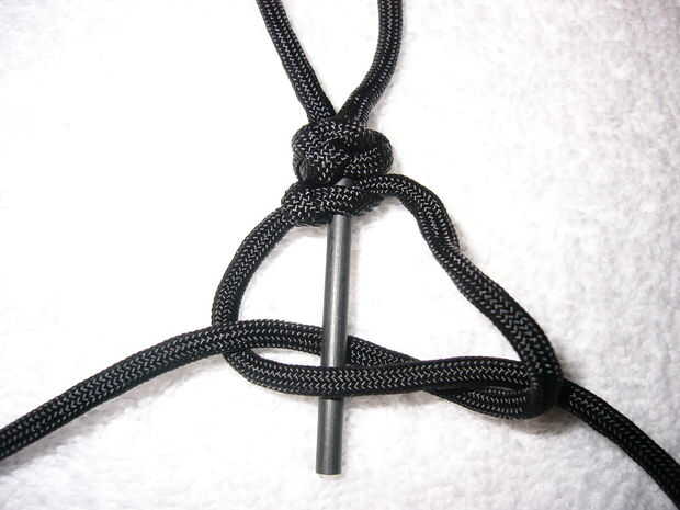 a continuación, vamos a guardar la cuerda en el collar. Inserte el firesteel o cualquier otro objeto que se utiliza en el centro del nudo cordón. Hacer la parte superior de lo visible, pero no sobresalen de la parte superior del nudo. La longitud de la cuerda de la izquierda se llamará eléctrica A, y el otro se llamará B. traer la cuerda B sobre el firesteel. Envoltura eléctrica A eléctrica A y detrás el firesteel. Tire a través del bucle de cable B y apriete. Eléctrica A debe ser ahora a la derecha y cordón B debe ser la izquierda. Llevar cable B el firesteel otra vez y envolver A cable alrededor de ella. De traerlo detrás el firesteel y a través del lazo otra vez. Apriete así. Repita hasta que no haya más firesteel restante. Inserte un anillo pequeño con cable B y lazo otra vez alrededor de algo más, luego deslícelo hacia fuera. Deslice eléctrica A sobre el anillo de la saliva antes de apretar. El arillo debe sobresalir de la parte inferior de la última puntada. Felicitaciones, haya terminado con la puntada de cobra.