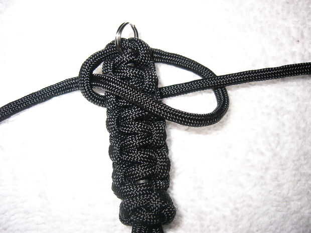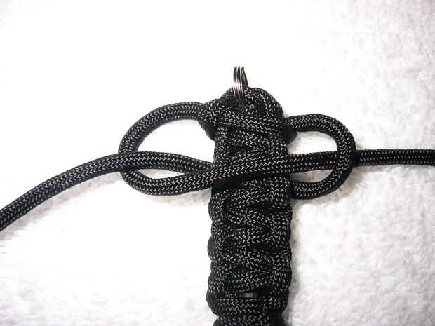 Un rey cobra es una puntada de cobra atada sobre otra puntada de cobra. Atar otro stich cobra alrededor de la puntada de la cobra, pero tratar de hacer las estudiantes que corren detrás de la línea de puntada entre las protuberancias de la puntada de cobra por debajo de ella. Saber esto suena complicado, pero sólo tienes que seguir las imágenes. Lazo hasta que tengas no más baches entre, entonces dar vuelta alrededor y atar otro sobre él. Esto permite mantener una gran cantidad de cable en un espacio de small(ish).
