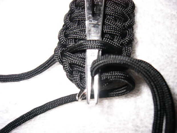 Hay dos maneras de rematar los nudos. Puede cortar los restantes extremos cortos y derretir los extremos en blobs de nilón sólido o hacerlo al revés. La otra manera requiere un hemostato o alicates de punta, pero se ve mejor. Inserte las pinzas o pinzas hemostáticas en un bucle de cuerda y pellizcar uno de los extremos restantes. Tirar bajo los lazos y dejar ir. Lo mismo para el extremo restante bajo el mismo bucle. Hacer esto otra vez bajo el siguiente bucle consecutivo. Cortar los extremos cortos y funden en gotas de nylon. No derrita el cable a los otros bucles o mutuamente como esto hará que sea difícil de deshacer cuando se necesita el cable.
