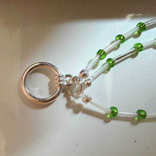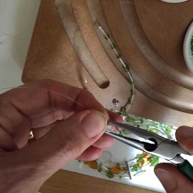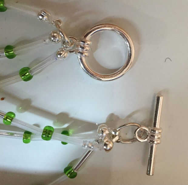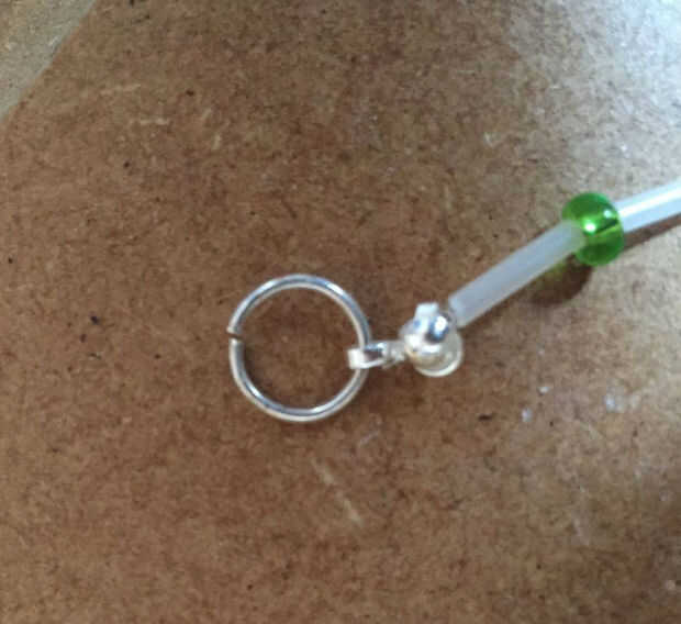 Me usa un casquete para cubrir cada nudo de tope, doblado con los alicates, luego recortar el exceso de hilo. Los tres calottes se rosca a un anillo del salto abierto, junto con una mitad de la hebilla. Las anillas de cierre había terminado el collar.