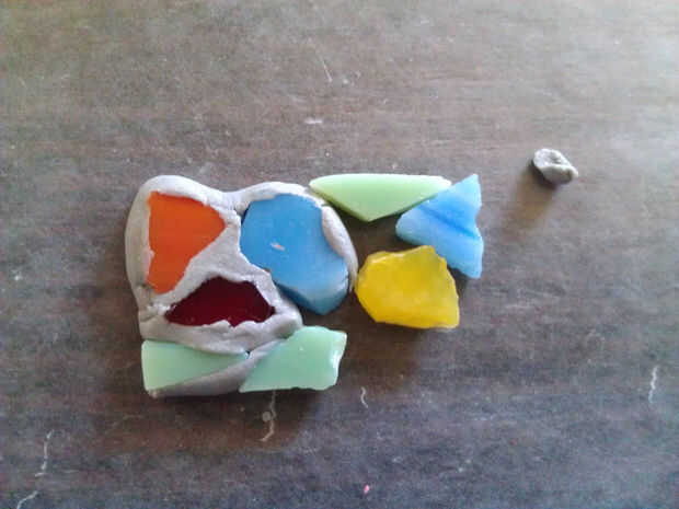 Comenzar arreglando las virutas de cristal en un pedazo de papel encerado. Mi diseño es solamente aproximadamente una pulgada a través. Reorganizar las piezas hasta encontrar un áspero cuadrado o rectangular de diseño que más te guste. No intento hacer un diseño específico para mi collar. Su diseño será diferente a la mía. Virutas de cristal nunca se cortan exactamente de la misma manera, y vidrieras tiene variación de color y el grosor de cada pieza.
