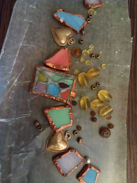 Esta parte de las instrucciones varía con expresión artística individual. Yo sabía que quería la ventana manchada como la pieza central, con dos o tres piezas de vidrio de compañero a cada lado, así que puse las piezas sobre una superficie plana. Trabajo en un pedazo de fieltro o goma espuma densa desalentará cuentas rueden. Sacó mis tarros de basura de piezas de la joyería y los granos y había probado diferentes combinaciones. Decidí que me gustaba perlas y corazón encantos (posteriormente desechados) en un metálico opaco y algunas perlas de vidrio que tenían un color de vidrio con un corte imperfecto. Esto le dio a mi collar "look" de una mano rústico, forjado, arte del metal. Cadena de mis encantos y granos para sólo unas pocas pulgadas y coloque una cadena de metal y cierre de la parte de atrás del collar. Mi cadena era un collar de cadena de metal de desecho, roto por la mitad con alicates de punta y alicate. Su collar se verá diferente a la mía. En lugar de intentar hacer una copia exacta de mi collar, trate de hacer su propio diseño usando piezas de la joyería rota que tiene escondido en su sala de arte.