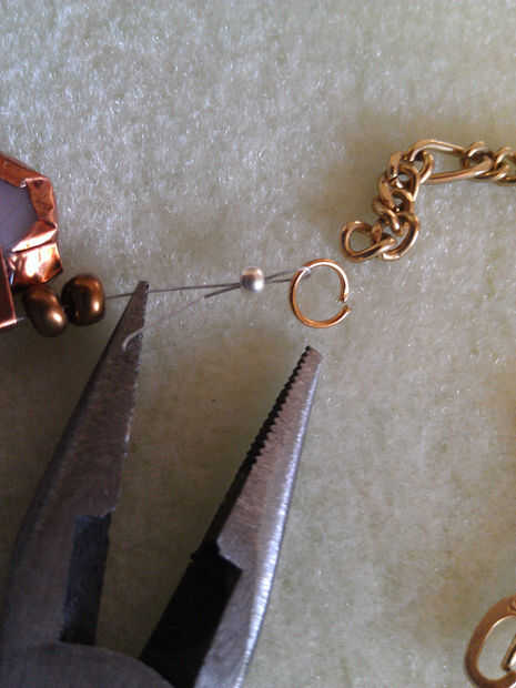 Cortar un trozo de alambre de abalorios y los encantos y los granos en el cable del hilo de rosca. Una gota de presión en un extremo del cable del hilo de rosca, añadir un pequeño anillo y doble el alambre a través del grano de la encrespadura. (Chafas son cuentas especiales para este propósito). Ajuste el cable (alimentación extremo suelto del cable en granos) y el grano de la encrespadura. Una herramienta de prensado funciona muy bien, pero un crafter talentoso puede hacer un par de agujas nariz alicates trabajo casi tan bien. Repita en el otro extremo del alambre, tirando el alambre apretado, pero dejando un poco de espacio extra para que los encantos y los granos que flotan libremente. Utilice alicates de punta (y más anillos, si es necesario) unir cada extremo del encanto cubierto alambre a la cadena de reciclado en cada lado. No necesito añadir un broche, ya que he dejado el cierre de la cadena reciclada.