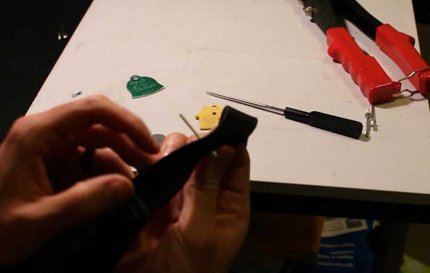 Ponga el vástago del remache en la pistola de remache y tire de la palanca hasta que salga. Desechar el tallo y el remache de la prueba tirando un poco de la etiqueta.