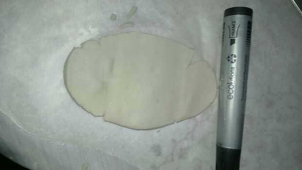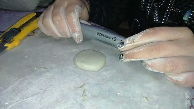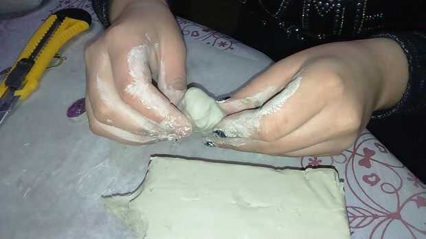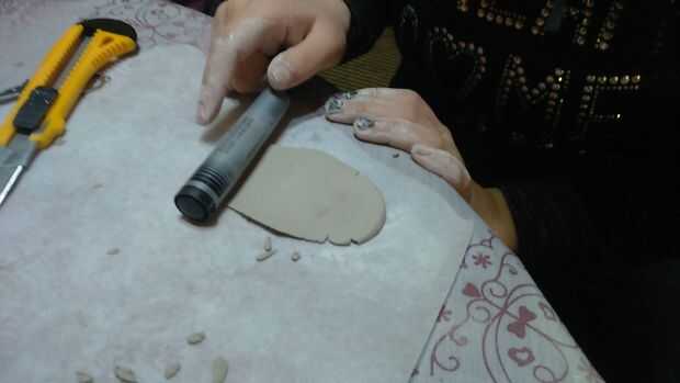 Take the clay and strech it. Poner el vaso en él y cortar la arcilla alrededor.