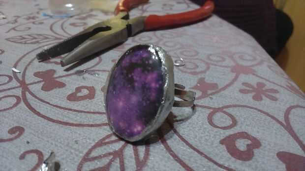 Hacer agradable círculo con unas tijeras o con bisturí. Color con esmalte de uñas después de que se seque. Ahora usted puede pegar simplemente el anillo del salto, pero hice un anillo.